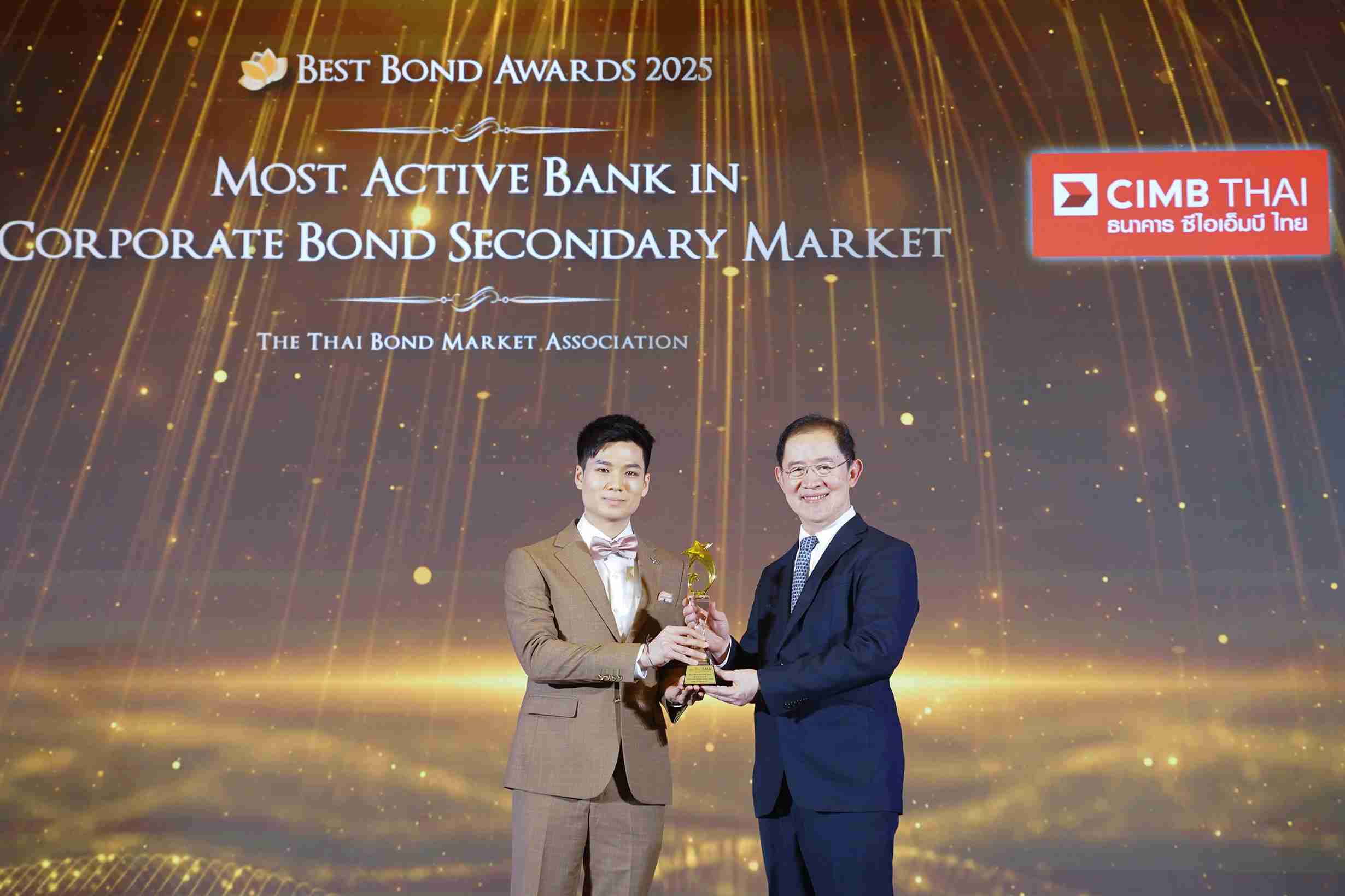 โดยมี สิทธิเมธ อังคณานนท์ Manager Credit Trading and Market Making, เอมอร พฤกษานุวงศ์ EVP, Head, Institutional Sales และ ชุตินารถ บุญสนองกิจ SVP, Head Rate Trading เป็นตัวแทนทีม Treasury & Markets ธนาคาร ซีไอเอ็มบี ไทย ขึ้นรับรางวัล ซึ่งรางวัลดังกล่าวสะท้อนความไว้วางใจจากผู้ร่วมตลาดและลูกค้าสถาบัน ในการสนับสนุนสภาพคล่องในตลาดรอง รวมถึงการเชื่อมโยงผู้ออกตราสารกับนักลงทุนทั้งสถาบันและรายย่อย นับเป็นส่วนสำคัญในการพัฒนาตลาดตราสารหนี้ไทยให้มีประสิทธิภาพและเติบโตอย่างต่อเนื่อง